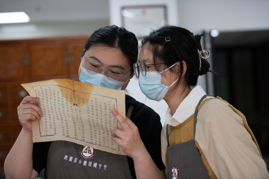 Book restorer Jin Xin restores a book at Anhui Provincial Library in Hefei, east China's Anhui Province, June 24, 2025. (Xinhua/Zhang Duan)Book restorers Zhang Wenwen (R) and Jin Xin discuss during restoration work at Anhui Provincial Library in Hefei, east China's Anhui Province, June 17, 2025. (Xinhua/Zhang Duan)