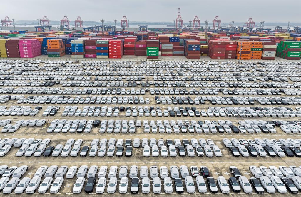 An aerial drone photo taken on Oct. 13, 2025 shows vehicles ready to be exported at Longtan Container Terminal of Nanjing Port, east China's Jiangsu Province. (Photo by Fang Dongxu/Xinhua)