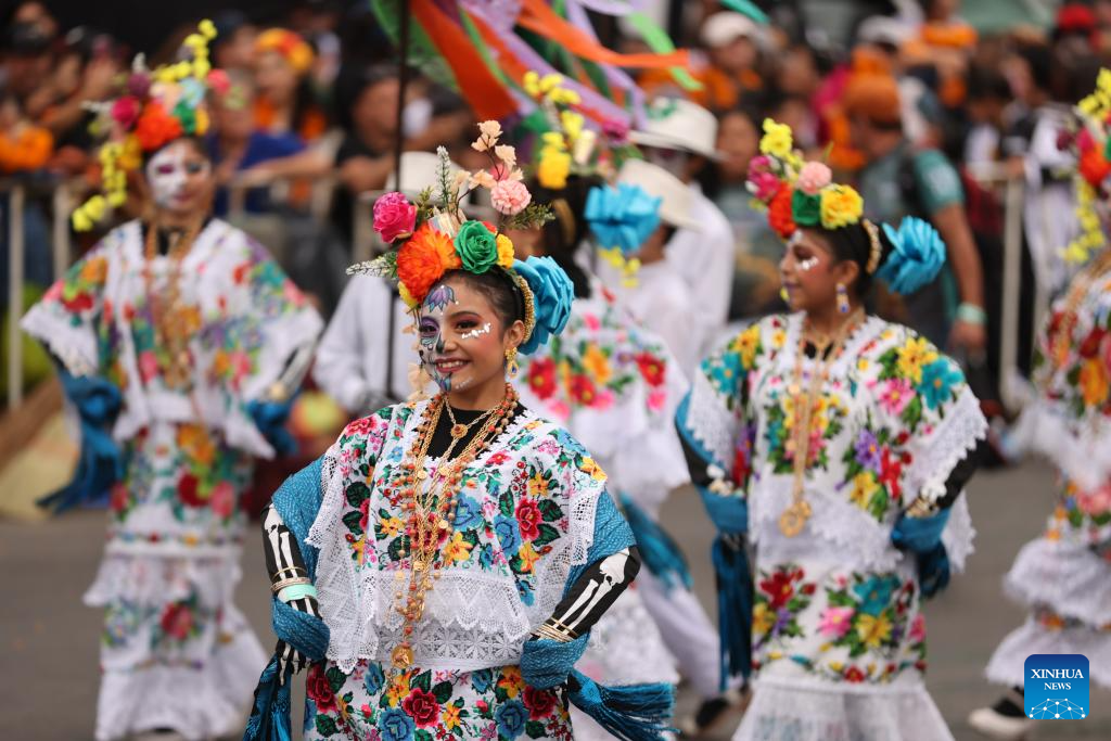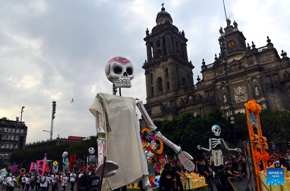 This photo taken on Nov. 1, 2025 shows a scene during the Day of the Dead Parade in downtown Mexico City, capital of Mexico. (Xinhua/Zhang Lei)