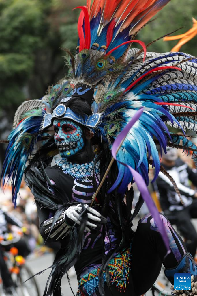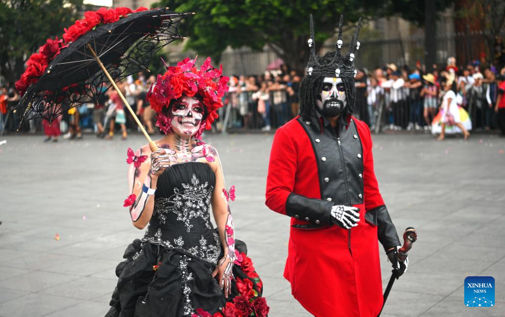 People in costumes and facial makeup participate in the Day of the Dead Parade in downtown Mexico City, capital of Mexico, Nov. 1, 2025. (Xinhua/Li Mengxin)