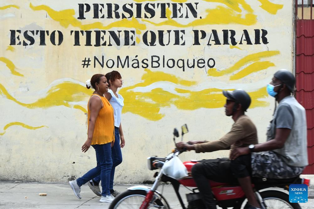 Pedestrians walk past a wall painting condemning the U.S. economic blockade against Cuba, in Havana, capital of Cuba, Nov. 5, 2025. (Photo by Joaquín Hernández/Xinhua)