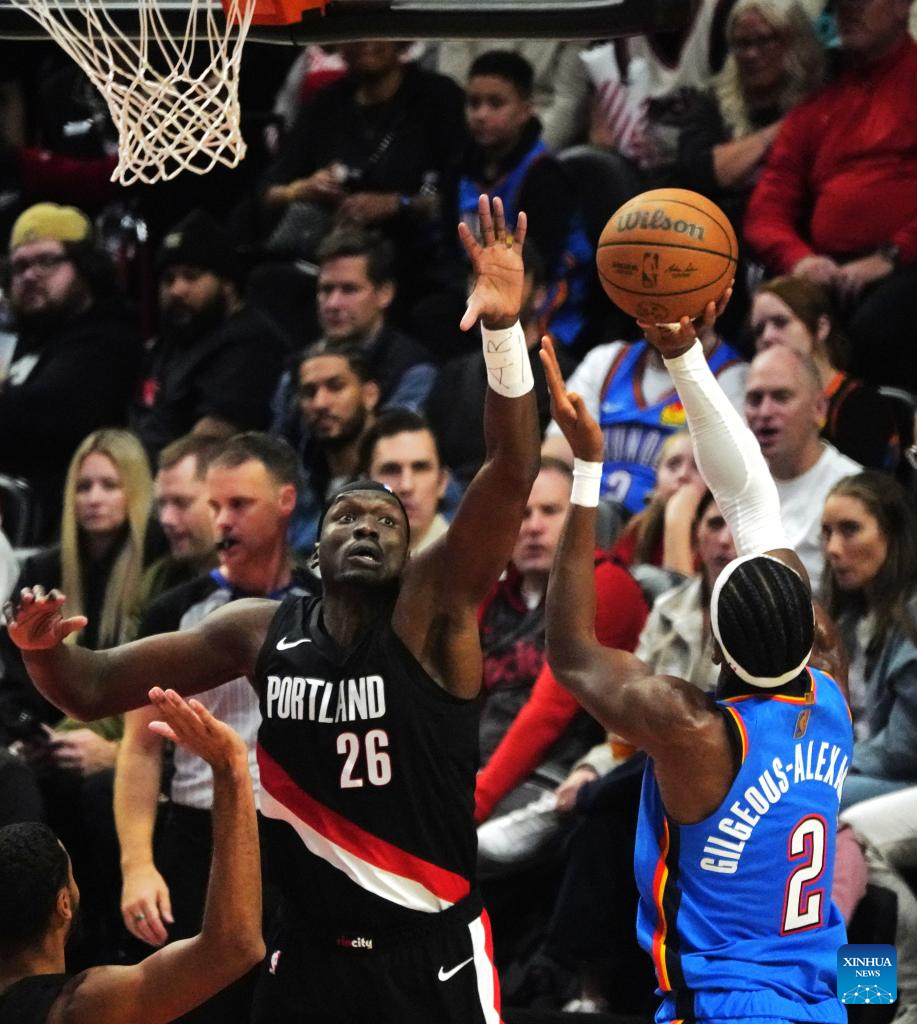 Deni Avdija (C) of Portland Trail Blazers competes during the 2025-2026 NBA regular season match between Portland Trail Blazers and Oklahoma City Thunders in Portland, the United States, Nov. 5, 2025. (Xinhua/Wu Xiaoling)