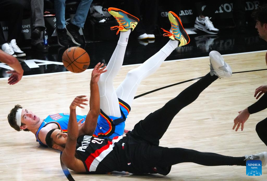 Kris Murray (bottom) of Portland Trail Blazers competes during the 2025-2026 NBA regular season match between Portland Trail Blazers and Oklahoma City Thunders in Portland, the United States, Nov. 5, 2025. (Xinhua/Wu Xiaoling)