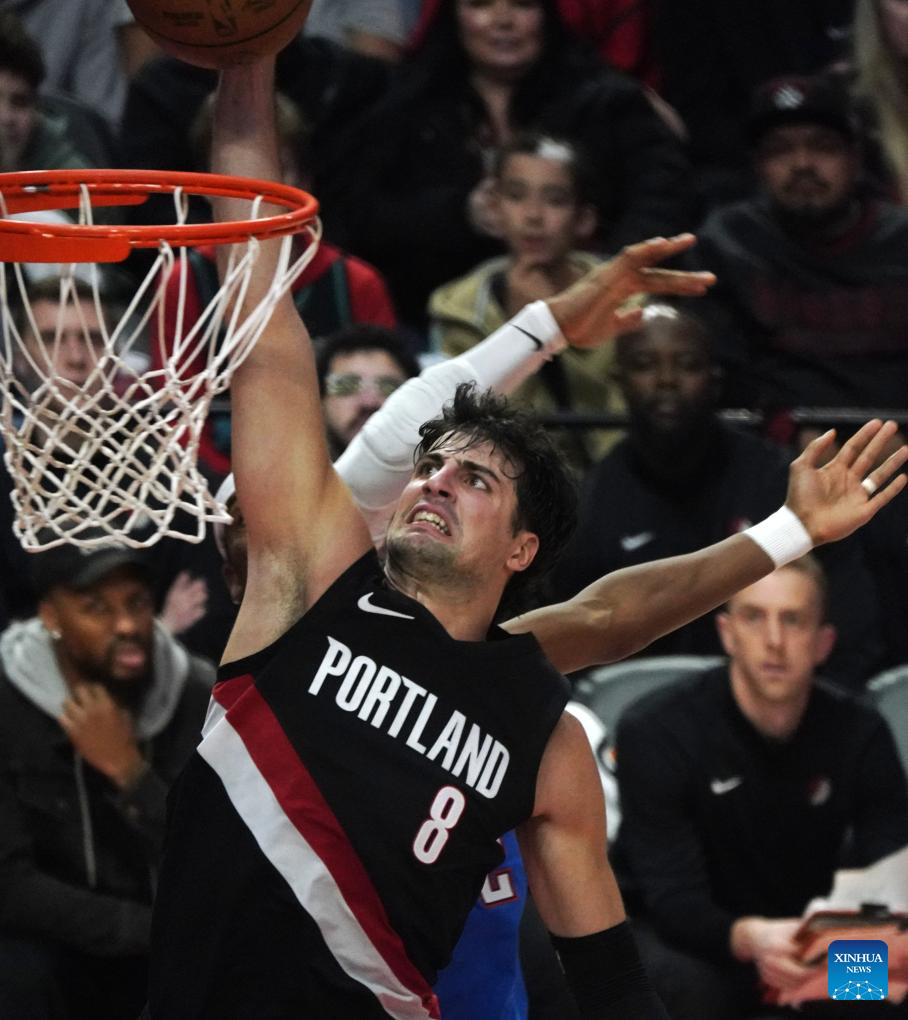 Deni Avdija (R) of Portland Trail Blazers goes for a layup during the 2025-2026 NBA regular season match between Portland Trail Blazers and Oklahoma City Thunders in Portland, the United States, Nov. 5, 2025. (Xinhua/Wu Xiaoling)