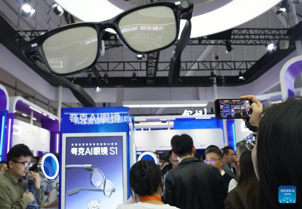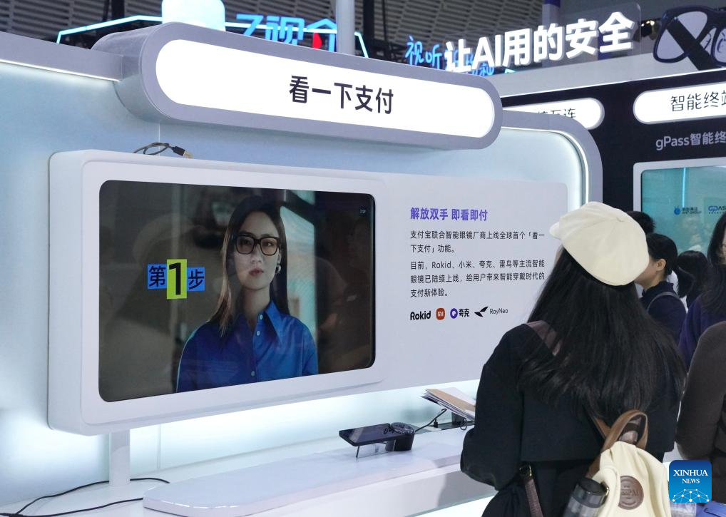 A visitor tries a pair of AI-powered glasses at the 2025 World Internet Conference (2025 WIC) Light of Internet Expo in Wuzhen, east China's Zhejiang Province, Nov. 6, 2025. The expo kicked off here on Thursday, showcasing more than 1,000 cutting-edge AI technology products from over 600 domestic and overseas enterprises. (Xinhua/Liu Qiong)