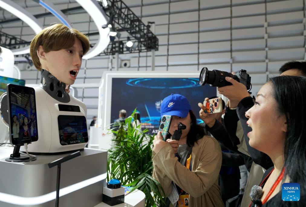 People learn about a humanoid robot at the 2025 World Internet Conference (2025 WIC) Light of Internet Expo in Wuzhen, east China's Zhejiang Province, Nov. 6, 2025. The expo kicked off here on Thursday, showcasing more than 1,000 cutting-edge AI technology products from over 600 domestic and overseas enterprises. (Xinhua/Huang Zongzhi)