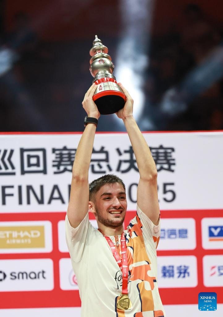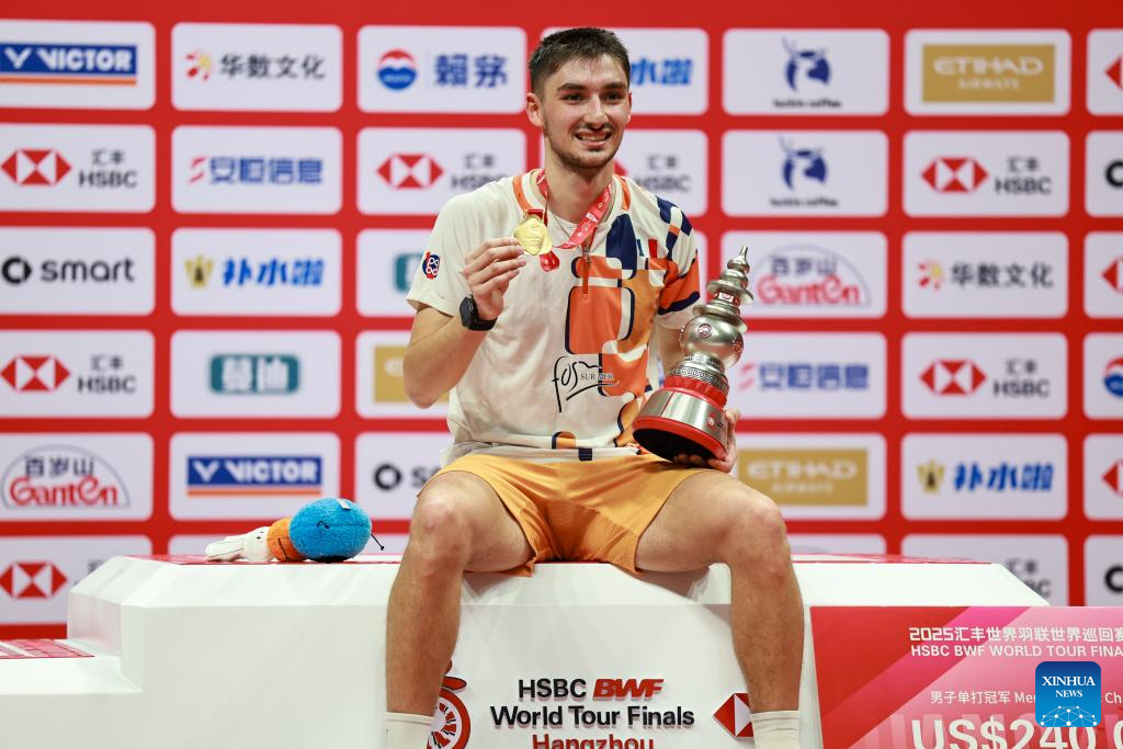 Winner Christo Popov poses during the awarding ceremony for the men's singles final between Shi Yuqi of China and Christo Popov of France at BWF World Tour Finals 2025 in Hangzhou, east China's Zhejiang Province, Dec. 21, 2025. (Xinhua/Jiang Han)