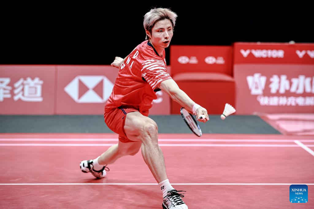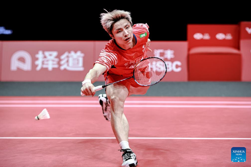 Shi Yuqi of China hits a return during the men's singles final against Christo Popov of France at BWF World Tour Finals 2025 in Hangzhou, east China's Zhejiang Province, Dec. 21, 2025. (Xinhua/Jiang Han)