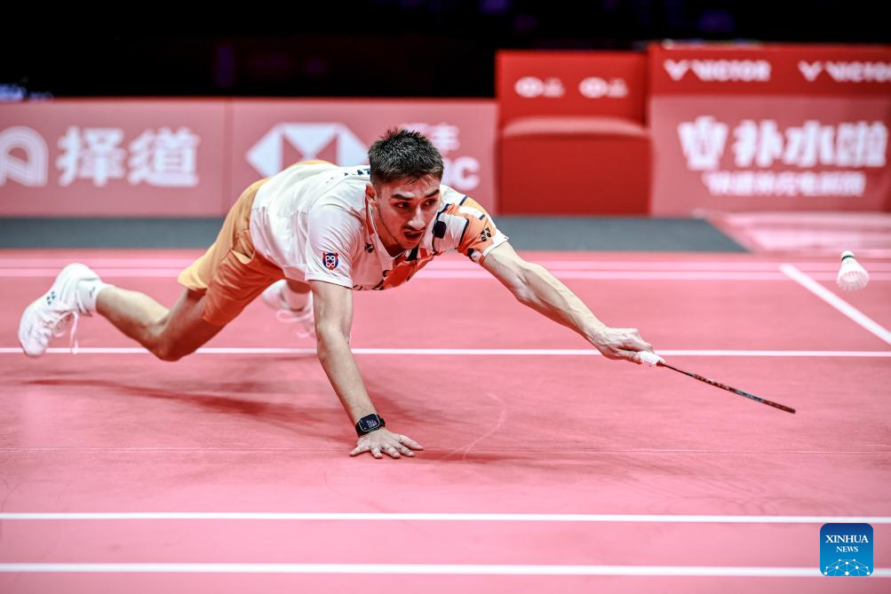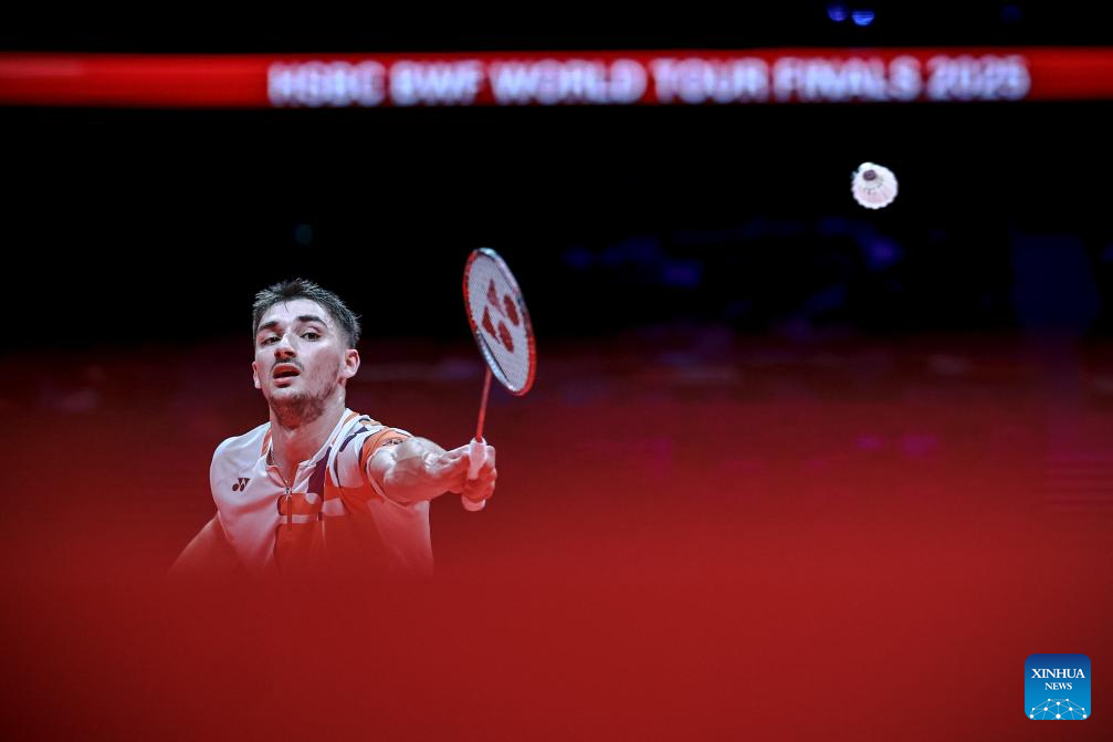 Christo Popov of France hits a return during the men's singles final against Shi Yuqi of China at BWF World Tour Finals 2025 in Hangzhou, east China's Zhejiang Province, Dec. 21, 2025. (Xinhua/Jiang Han)