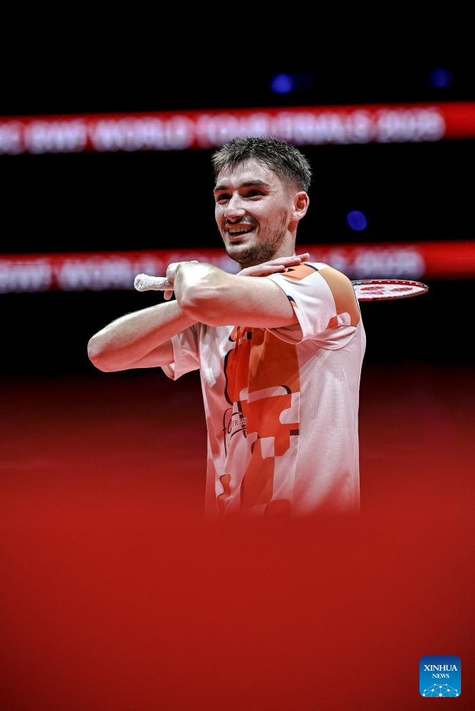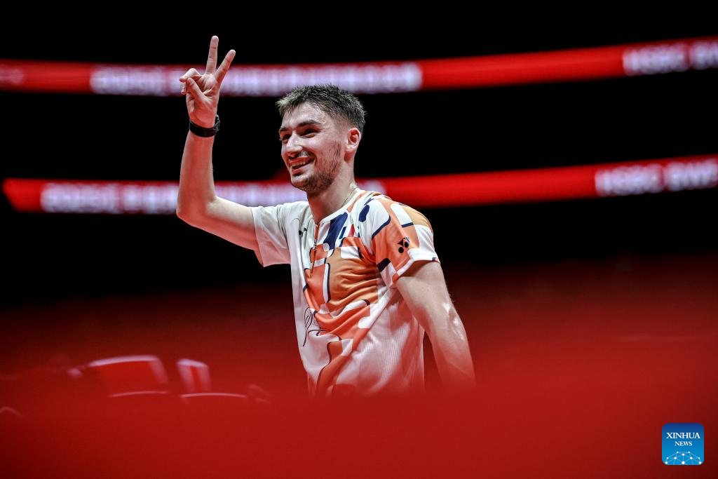 Christo Popov of France celebrates a score during the men's singles final against Shi Yuqi of China at BWF World Tour Finals 2025 in Hangzhou, east China's Zhejiang Province, Dec. 21, 2025. (Xinhua/Jiang Han)