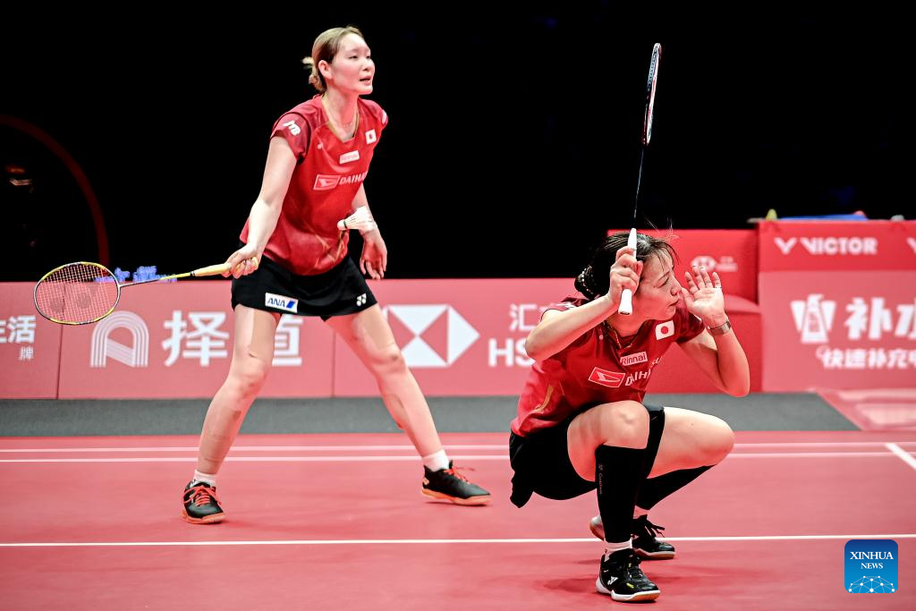 Fukushima Yuki (L)/Matsumoto Mayu of Japan compete during the women's doubles final between Baek Ha Na/Lee So Hee of South Korea and Fukushima Yuki/Matsumoto Mayu of Japan at BWF World Tour Finals 2025 in Hangzhou, east China's Zhejiang Province, Dec. 21, 2025. (Xinhua/Jiang Han)