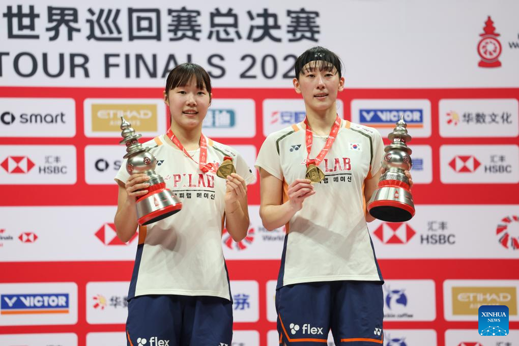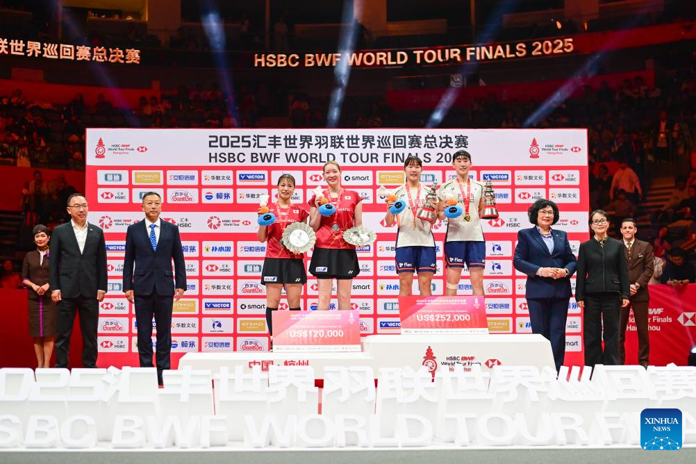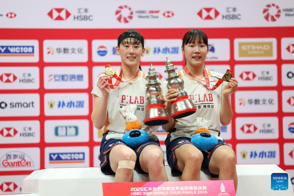 Baek Ha Na/Lee So Hee (L) of South Korea pose on the podium during the awarding ceremony after the women's doubles final between Baek Ha Na/Lee So Hee of South Korea and Fukushima Yuki/Matsumoto Mayu of Japan at BWF World Tour Finals 2025 in Hangzhou, east China's Zhejiang Province, Dec. 21, 2025. (Xinhua/Jiang Han)