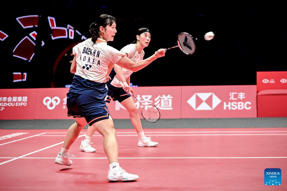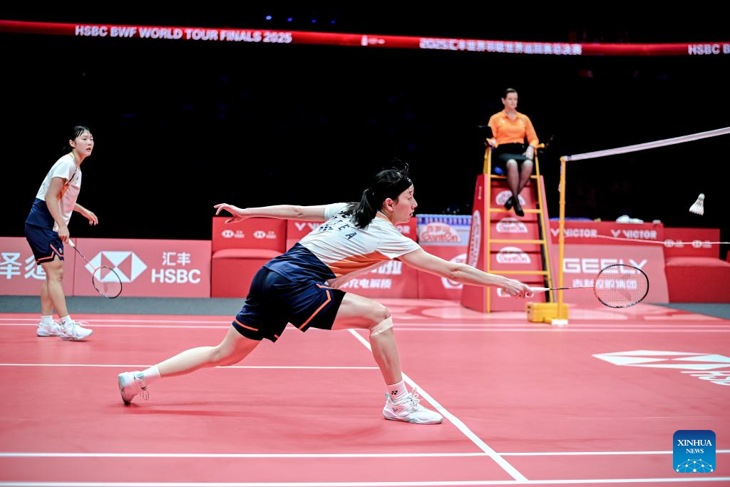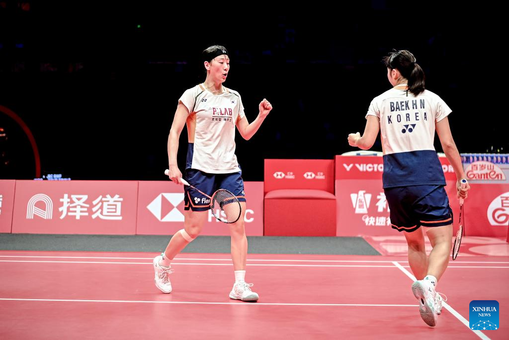 Baek Ha Na (L)/Lee So Hee of South Korea compete during the women's doubles final between Baek Ha Na/Lee So Hee of South Korea and Fukushima Yuki/Matsumoto Mayu of Japan at BWF World Tour Finals 2025 in Hangzhou, east China's Zhejiang Province, Dec. 21, 2025. (Xinhua/Jiang Han)
