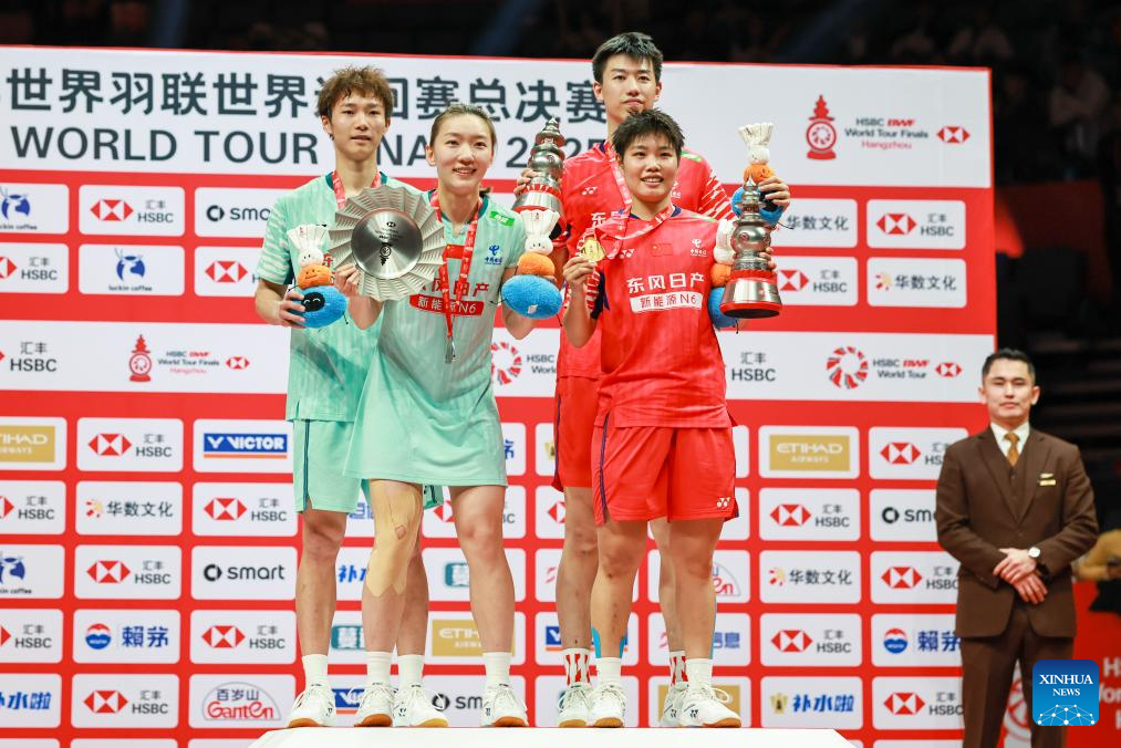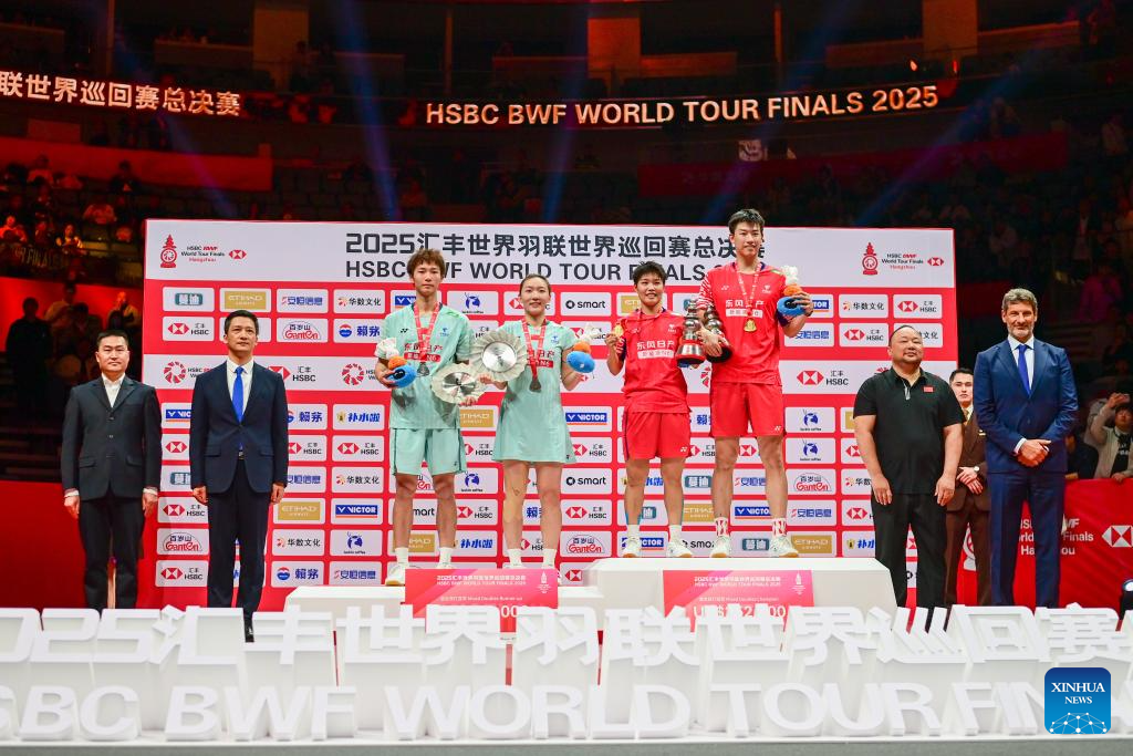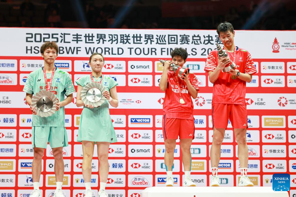 Gold medalists Feng Yanzhe (1st R)/Huang Dongping (2nd R) of China and silver medalists Jiang Zhenbang (1st L)/Wei Yaxin of China pose during the awarding ceremony after the mixed doubles final match at BWF World Tour Finals 2025 in Hangzhou, east China's Zhejiang Province, Dec. 21, 2025. (Xinhua/Jiang Han)