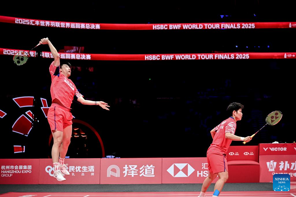 Feng Yanzhe (L)/Huang Dongping compete during the mixed doubles final match between Feng Yanzhe/Huang Dongping of China and Jiang Zhenbang/Wei Yaxin of China at BWF World Tour Finals 2025 in Hangzhou, east China's Zhejiang Province, Dec. 21, 2025. (Xinhua/Jiang Han)