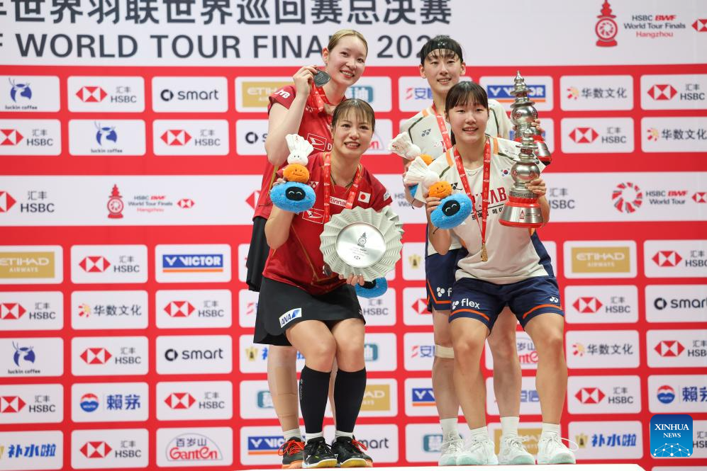 Baek Ha Na/Lee So Hee (R) of South Korea pose on the podium during the awarding ceremony after the women's doubles final between Baek Ha Na/Lee So Hee of South Korea and Fukushima Yuki/Matsumoto Mayu of Japan at BWF World Tour Finals 2025 in Hangzhou, east China's Zhejiang Province, Dec. 21, 2025. (Xinhua/Jiang Han)