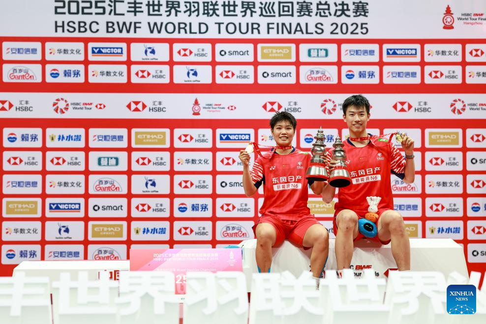 Gold medalists Feng Yanzhe (R)/Huang Dongping of China pose during the awarding ceremony after the mixed doubles final match between Feng Yanzhe/Huang Dongping of China and Jiang Zhenbang/Wei Yaxin of China at BWF World Tour Finals 2025 in Hangzhou, east China's Zhejiang Province, Dec. 21, 2025. (Xinhua/Jiang Han)