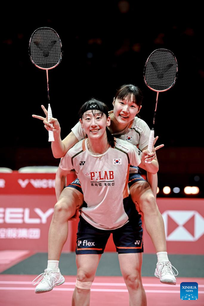 Baek Ha Na/Lee So Hee (L) of South Korea celebrate scoring during the women's doubles final between Baek Ha Na/Lee So Hee of South Korea and Fukushima Yuki/Matsumoto Mayu of Japan at BWF World Tour Finals 2025 in Hangzhou, east China's Zhejiang Province, Dec. 21, 2025. (Xinhua/Jiang Han)