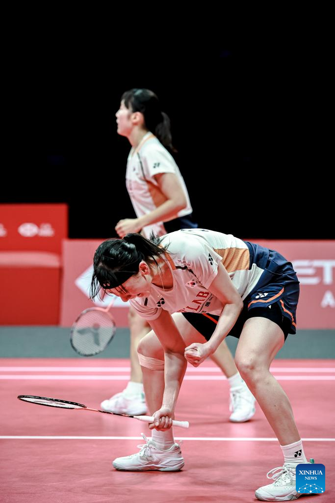 Fukushima Yuki (front)/Matsumoto Mayu of Japan compete during the women's doubles final between Baek Ha Na/Lee So Hee of South Korea and Fukushima Yuki/Matsumoto Mayu of Japan at BWF World Tour Finals 2025 in Hangzhou, east China's Zhejiang Province, Dec. 21, 2025. (Xinhua/Jiang Han)