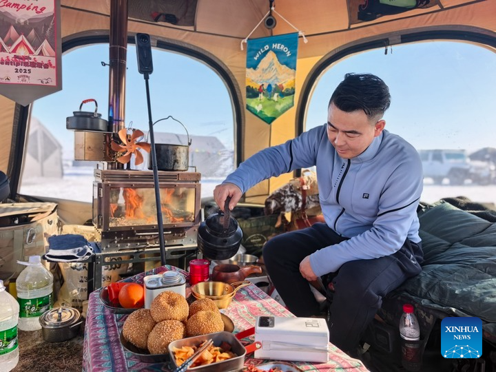 HARBIN, Jan. 17 (Xinhua) -- Driving over 3,000 kilometers from the subtropical warmth of south China's Guangdong Province, Zhu Yongyu, a camping enthusiast, finally reached the country's frozen northeast and pitched his tent on a patch of snow-blanketed grassland.