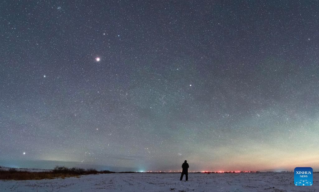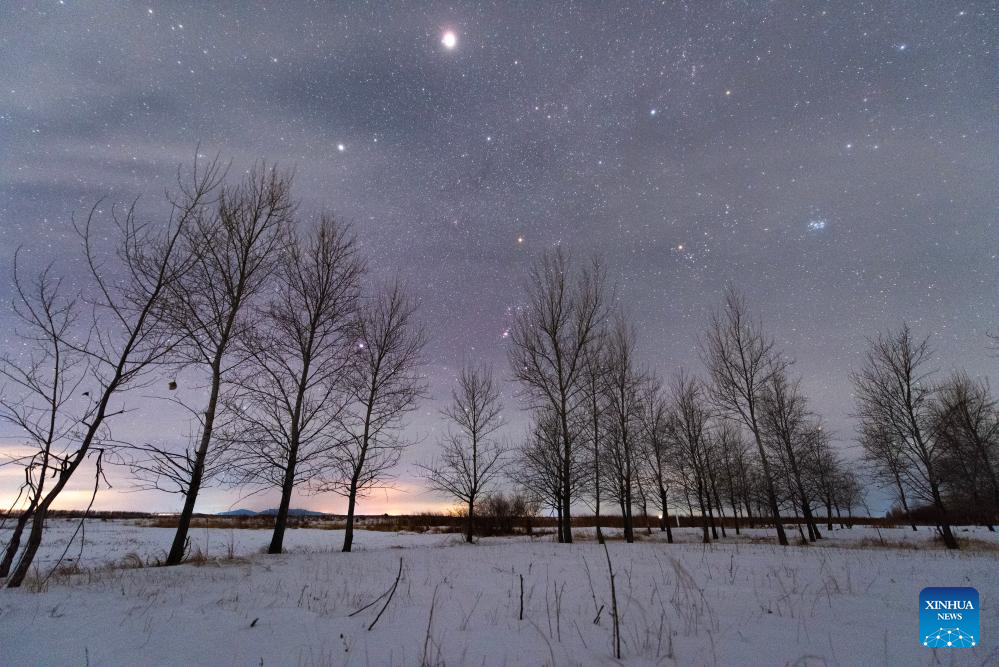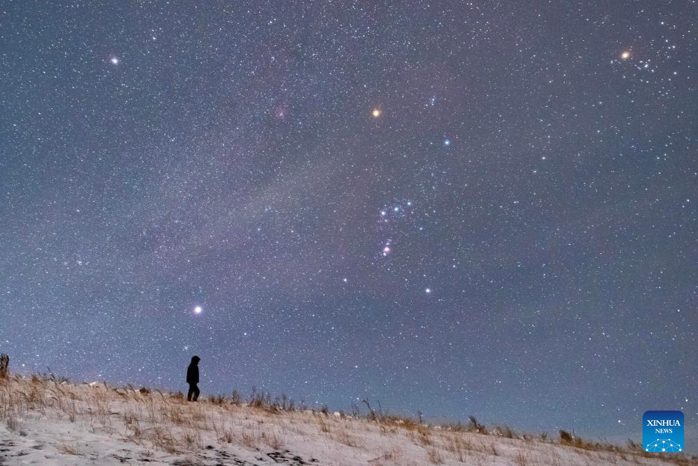 This photo taken on Jan. 18, 2026 shows a view of the planet of Jupiter and the Orion in Jiamusi City, northeast China's Heilongjiang Province. China's northernmost Heilongjiang Province has entered the golden period for winter starry sky observation. With auroras occasionally making an appearance, the brilliant starry sky and the icy landscape together unfold a serene and breathtaking picture. (Photo by Zhu Zongqiang/Xinhua)