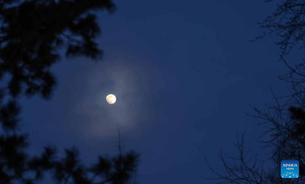 This photo taken on Jan. 31, 2026 shows a conjunction of Jupiter and the waxing gibbous moon over the sky of Jiayin County, northeast China's Heilongjiang Province. A conjunction of Jupiter and the waxing gibbous moon appeared over the sky on Saturday. (Photo by Li Shaojun/Xinhua)