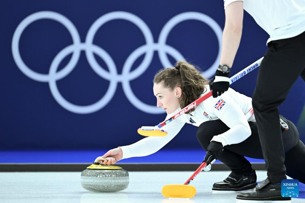 Jennifer Dodds of Britain competes during the curling mixed doubles round robin session 4 match between the Czech Republic and Britain of the 2026 Milan-Cortina Winter Olympics in Cortina D'Ampezzo, Italy, Feb. 5, 2026. (Xinhua/Lian Yi)