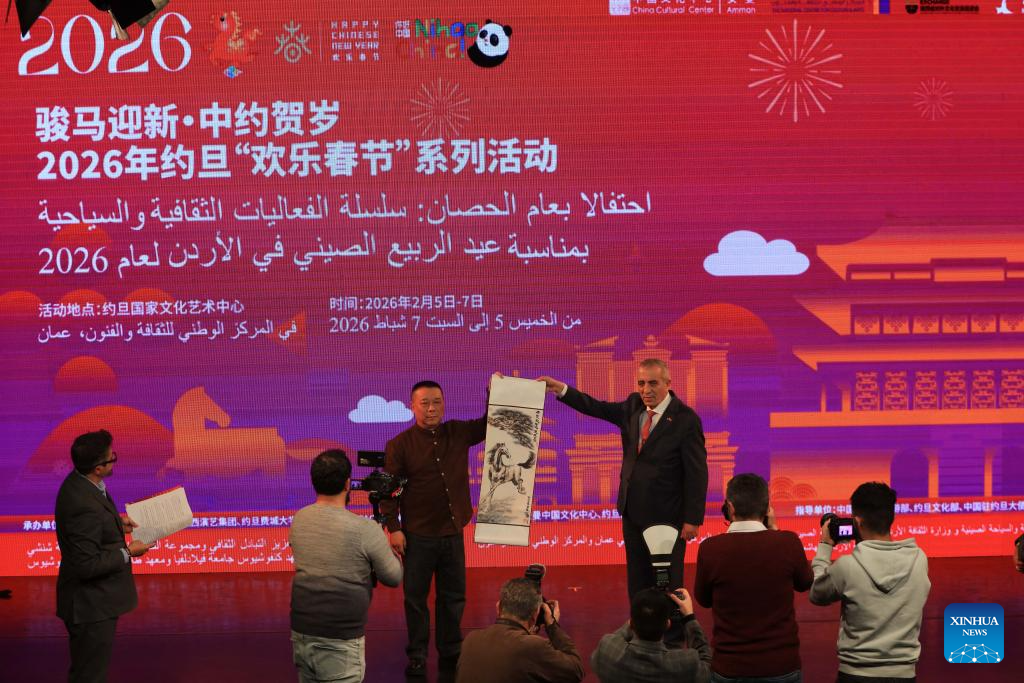 Jordanian Minister of Culture Mustafa Al-Rawashdeh (R, back) receives a painting gift from a Chinese artist at the opening ceremony for "Happy Chinese New Year" in Jordan celebrations at the Jordan National Center for Culture and Arts in Amman, Jordan, on Feb. 5, 2026. The 2026 "Happy Chinese New Year" in Jordan celebrations for the Year of the Horse launched on Thursday at the Jordan National Center for Culture and Arts. (Photo by Mohammad Abu Ghosh/Xinhua)