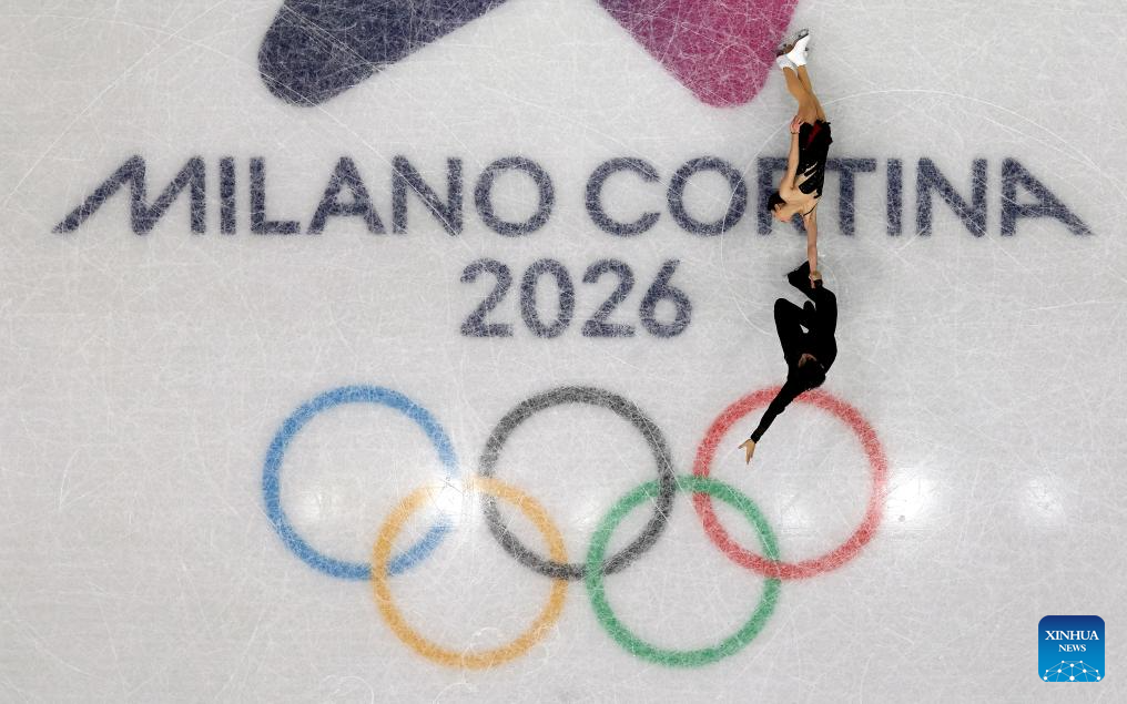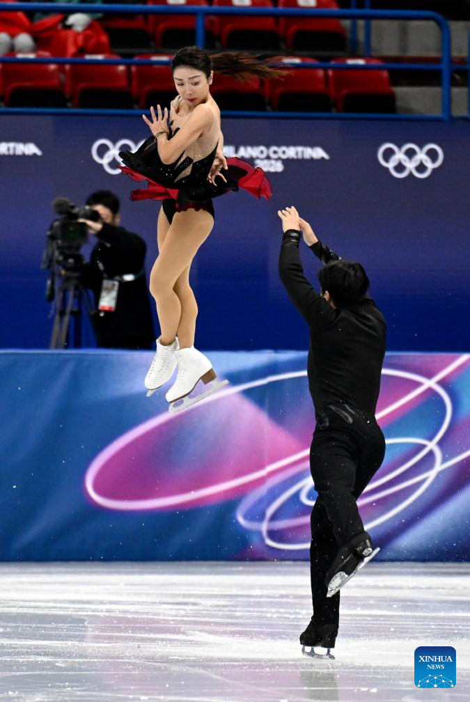 Sui Wenjing (up) and Han Cong of China perform during the figure skating team event pair skating short program of the Milan-Cortina 2026 Olympic Winter Games in Milan, Italy, Feb. 6, 2026. (Xinhua/Li Ming)