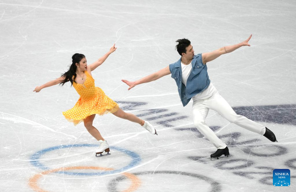 Madison Chock (R) and Evan Bates of the United States perform during the figure skating team event ice dance rhythm dance of the Milan-Cortina 2026 Olympic Winter Games in Milan, Italy, Feb. 6, 2026. (Xinhua/Li Ming)