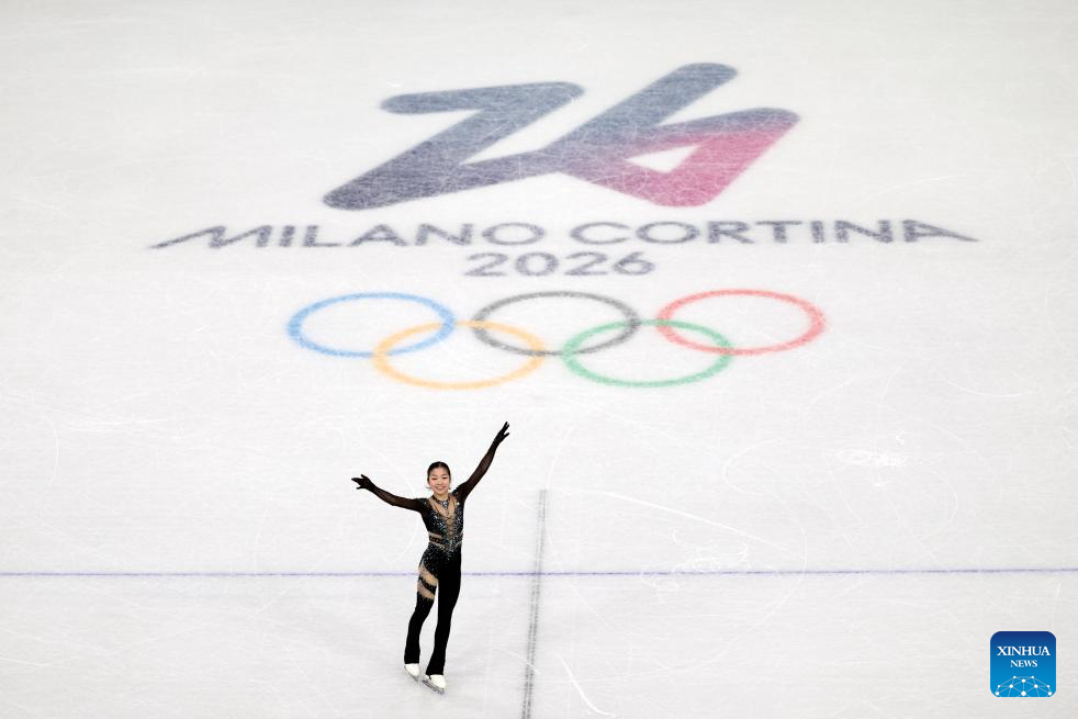 Zhang Ruiyang of China performs during the women single skating short program of the figure skating team event of the Milan-Cortina 2026 Olympic Winter Games in Milan, Italy, Feb. 6, 2026. (Xinhua/Cheng Min)