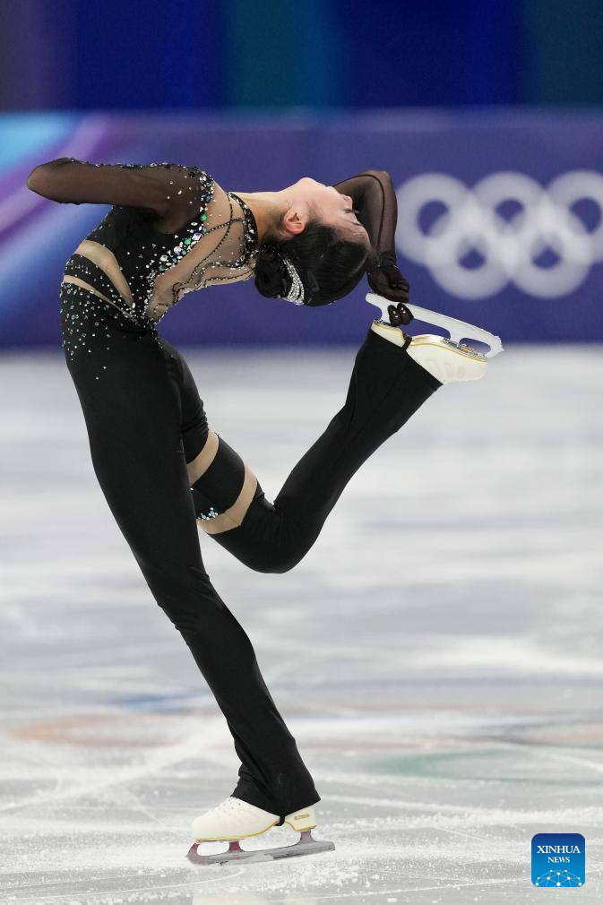 Zhang Ruiyang of China performs during the women single skating short program of the figure skating team event of the Milan-Cortina 2026 Olympic Winter Games in Milan, Italy, Feb. 6, 2026. (Xinhua/Chen Yichen)