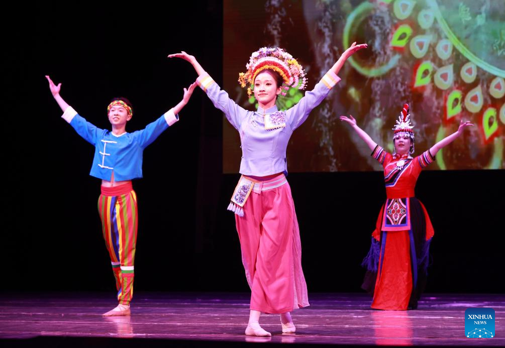 Dancers perform at the "Happy Chinese New Year in Bishkek 2026" cultural show in Bishkek, Kyrgyzstan, Feb. 4, 2026. The show was presented by a joint artistic group composed of Fujian Vocational College of Art, Fujian Acrobatic Troupe, Fujian song and dance theater, and Quanzhou Gaojia Opera Heritage Center. The program included songs, dances, magic, acrobatics, local opera, and instrumental performances. Nearly 900 people watched the show at the scene. (Photo by Roman/Xinhua)