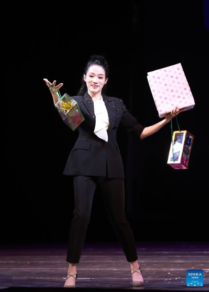 A magician performs at the "Happy Chinese New Year in Bishkek 2026" cultural show in Bishkek, Kyrgyzstan, Feb. 4, 2026. The show was presented by a joint artistic group composed of Fujian Vocational College of Art, Fujian Acrobatic Troupe, Fujian song and dance theater, and Quanzhou Gaojia Opera Heritage Center. The program included songs, dances, magic, acrobatics, local opera, and instrumental performances. Nearly 900 people watched the show at the scene. (Photo by Roman/Xinhua)