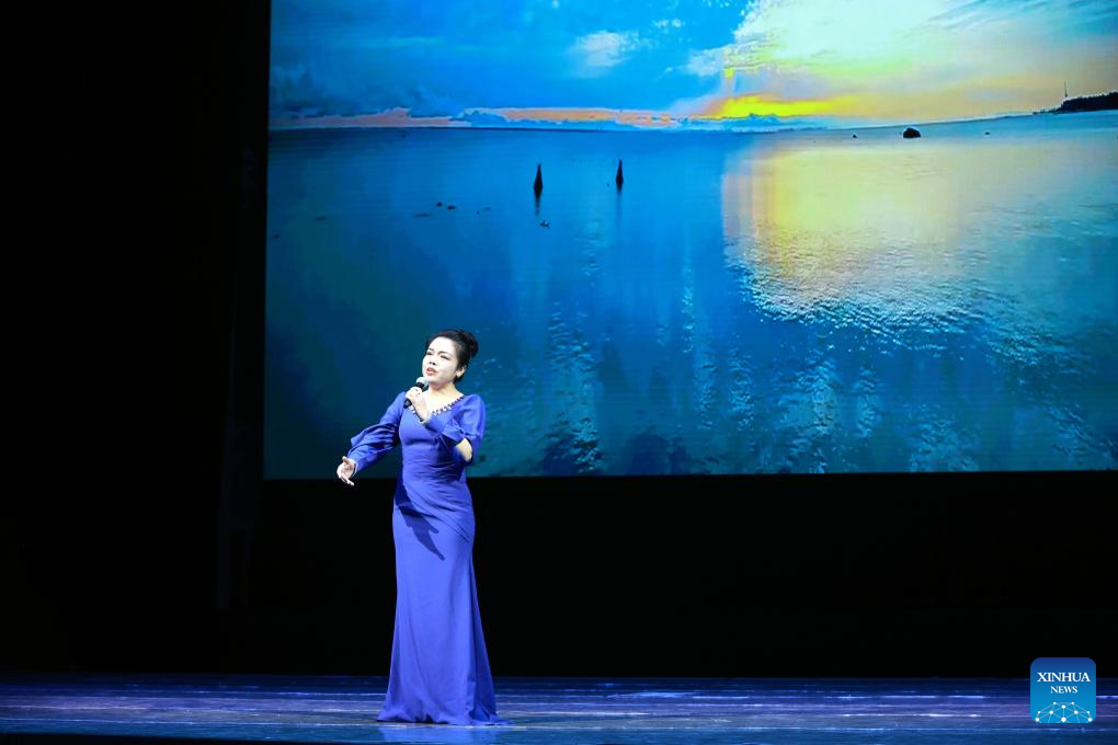 A singer performs at the "Happy Chinese New Year in Bishkek 2026" cultural show in Bishkek, Kyrgyzstan, Feb. 4, 2026. The show was presented by a joint artistic group composed of Fujian Vocational College of Art, Fujian Acrobatic Troupe, Fujian song and dance theater, and Quanzhou Gaojia Opera Heritage Center. The program included songs, dances, magic, acrobatics, local opera, and instrumental performances. Nearly 900 people watched the show at the scene. (Photo by Roman/Xinhua)