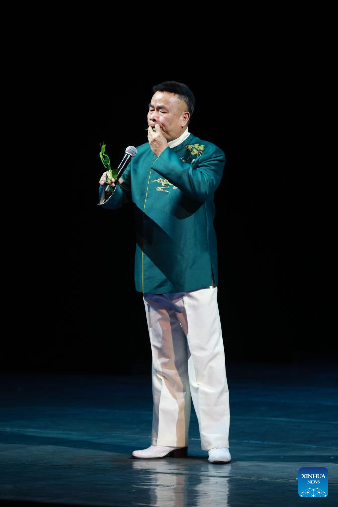 An artist plays a song by blowing leaves at the "Happy Chinese New Year in Bishkek 2026" cultural show in Bishkek, Kyrgyzstan, Feb. 4, 2026. The show was presented by a joint artistic group composed of Fujian Vocational College of Art, Fujian Acrobatic Troupe, Fujian song and dance theater, and Quanzhou Gaojia Opera Heritage Center. The program included songs, dances, magic, acrobatics, local opera, and instrumental performances. Nearly 900 people watched the show at the scene. (Photo by Roman/Xinhua)