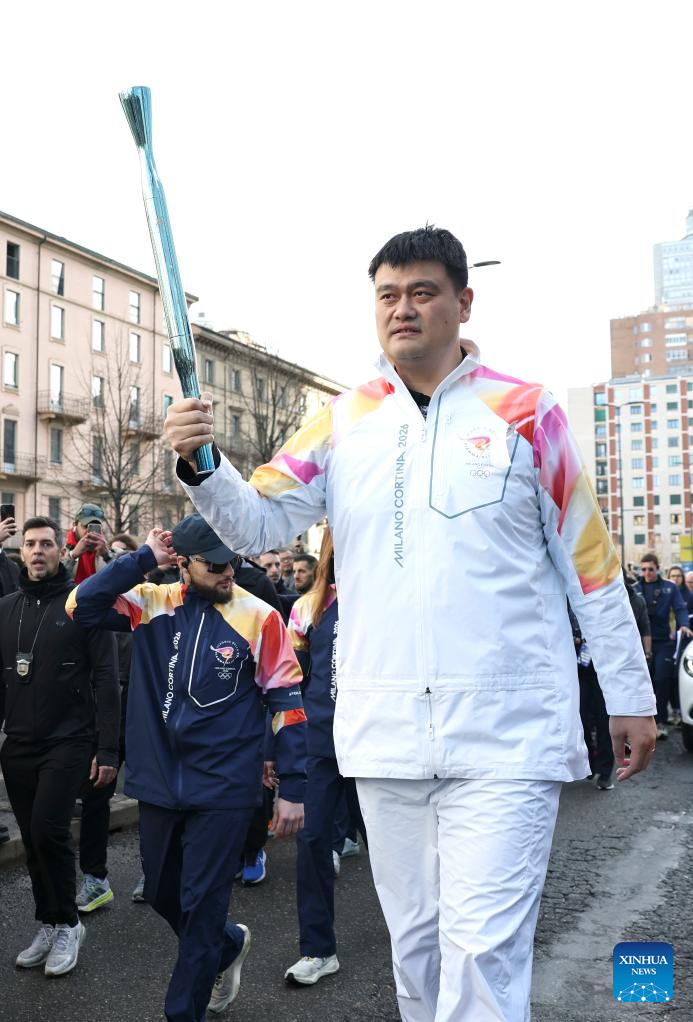Former Chinese basketball legend Yao Ming relays the torch during the torch relay for 2026 Milan-Cortina Winter Olympics in Milan, Italy, Feb. 6, 2026. (Xinhua/Li Jing)