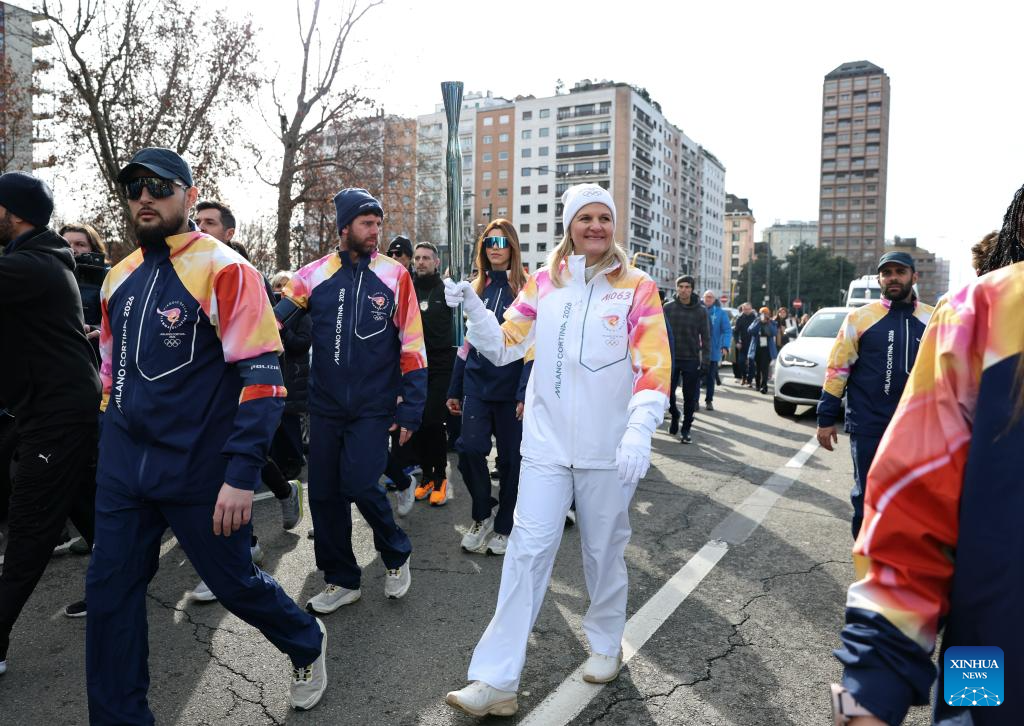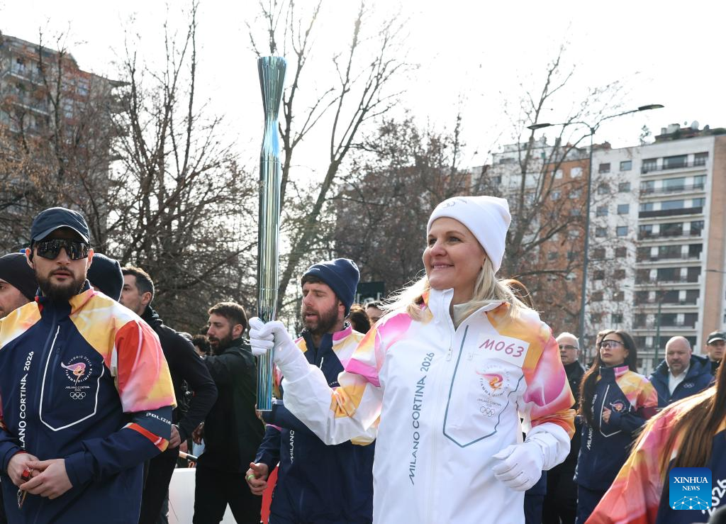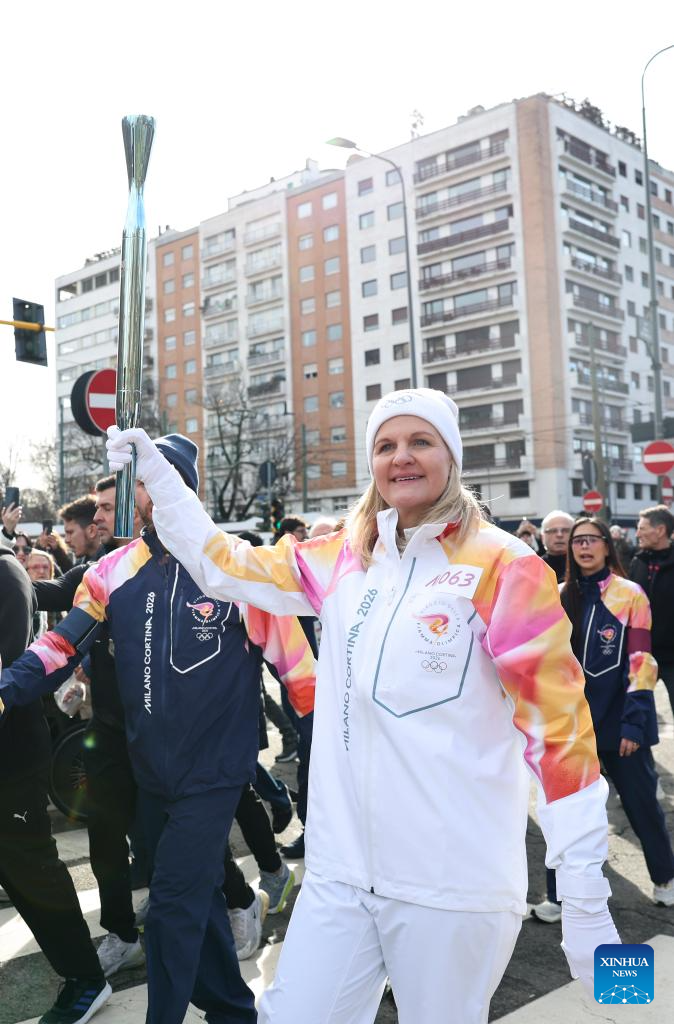 International Olympic Committee (IOC) President Kirsty Coventry holds the torch during the torch relay for 2026 Milan-Cortina Winter Olympics in Milan, Italy, Feb. 6, 2026. (Xinhua/Li Jing)