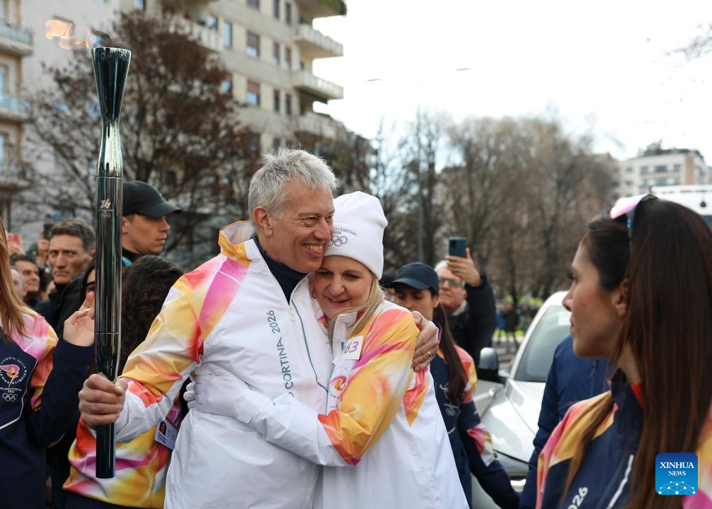 International Olympic Committee (IOC) President Kirsty Coventry (R) hugs Coca-Cola CEO James Quincey during the torch relay for 2026 Milan-Cortina Winter Olympics in Milan, Italy, Feb. 6, 2026. (Xinhua/Li Jing)