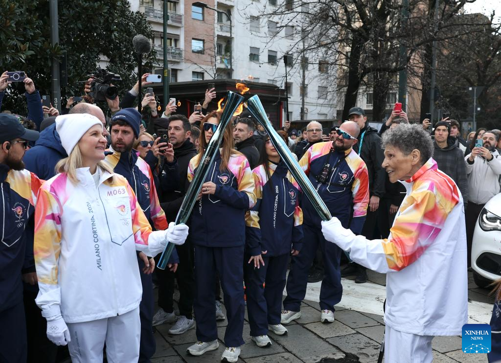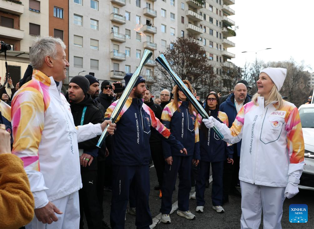 International Olympic Committee (IOC) President Kirsty Coventry (R) and Coca-Cola CEO James Quincey relay the torch during the torch relay for 2026 Milan-Cortina Winter Olympics in Milan, Italy, Feb. 6, 2026. (Xinhua/Li Jing)