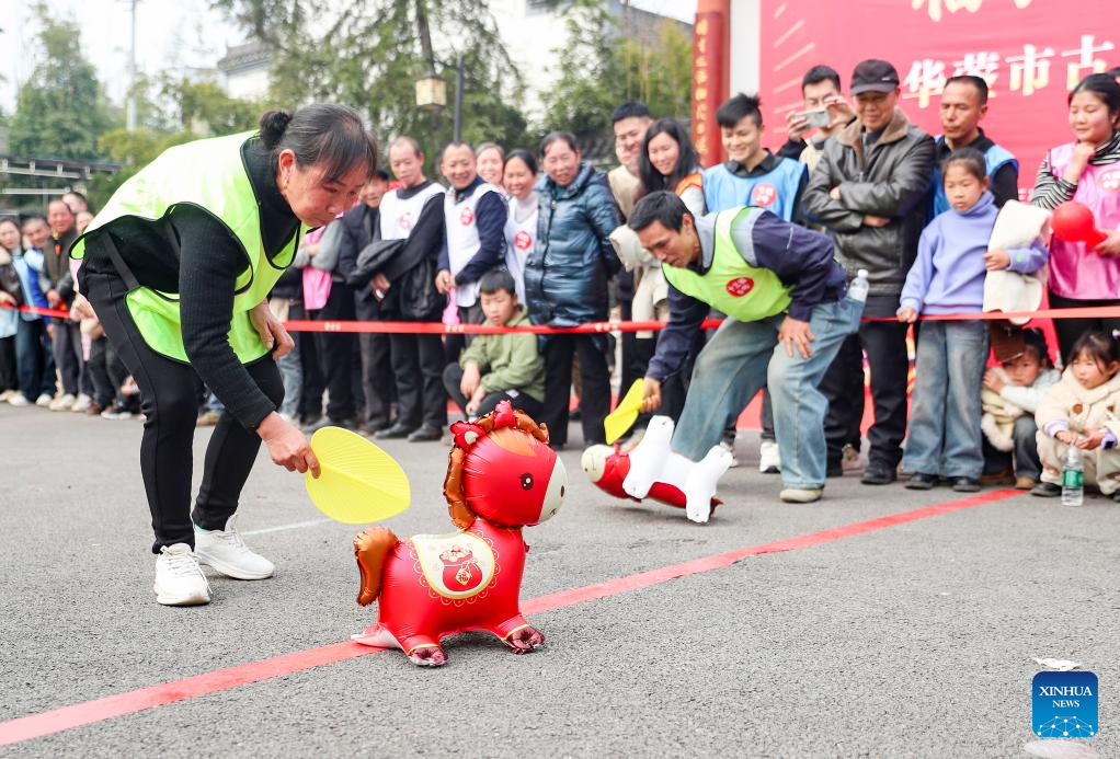 People take part in a "horse race" game to greet the Year of the Horse in Huaying City, southwest China's Sichuan Province, Feb. 5, 2026. With the Spring Festival drawing near, various festive events are held across the country to celebrate the Chinese New Year. (Photo by Qiu Haiying/Xinhua)