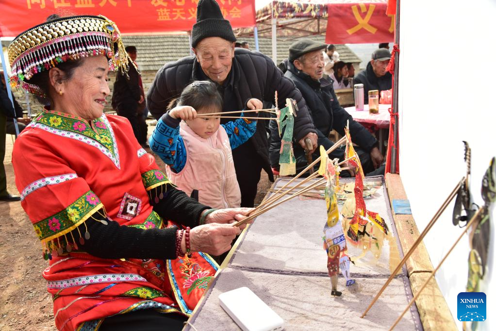 A girl learns to play shadow puppet from a folk artist during a village gala held in Chaishanqian Village, Zaozhuang City of east China's Shandong Province, Feb. 5, 2026. With the Spring Festival drawing near, various festive events are held across the country to celebrate the Chinese New Year. (Photo by Liu Mingxiang/Xinhua)