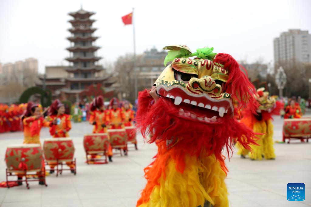 A Shehuo team performs lion dance at a square in Zhangye City, northwest China's Gansu Province, Feb. 5, 2026. With the Spring Festival drawing near, various festive events are held across the country to celebrate the Chinese New Year. (Photo by Chen Li/Xinhua)