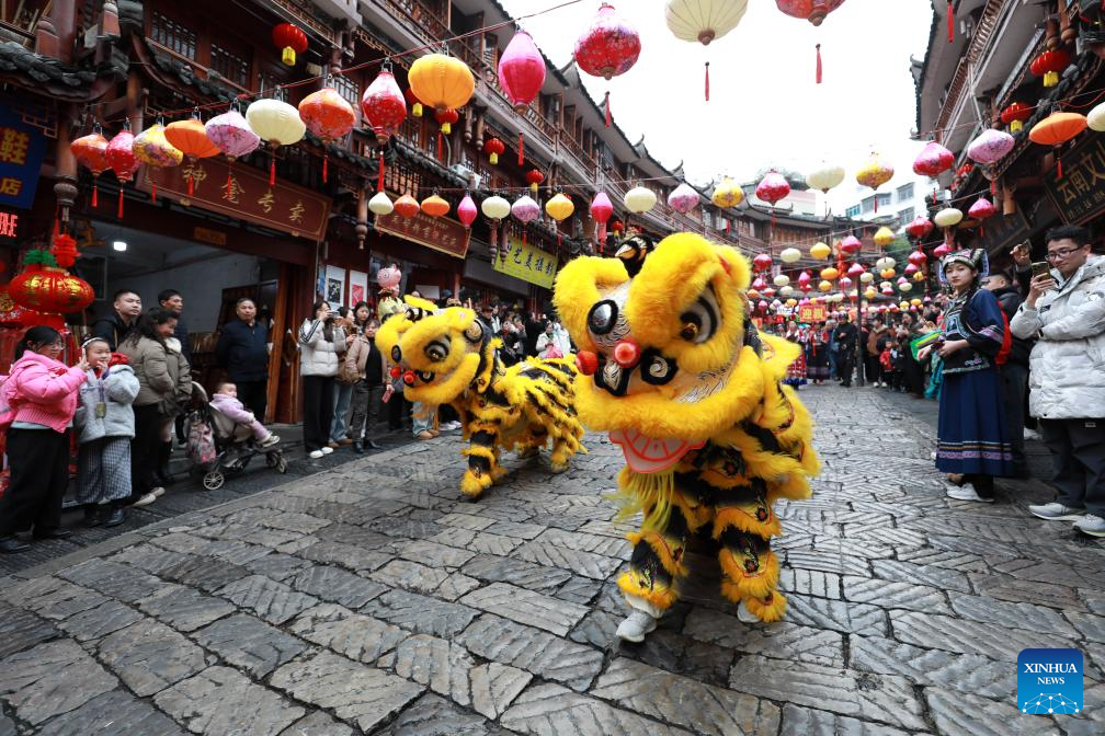 People watch a lion dance as a celebration for a wedding of Buyi ethnic group in Duyun City, southwest China's Guizhou Province, Feb. 5, 2026. With the Spring Festival drawing near, various festive events are held across the country to celebrate the Chinese New Year. (Photo by Xiao Wei/Xinhua)