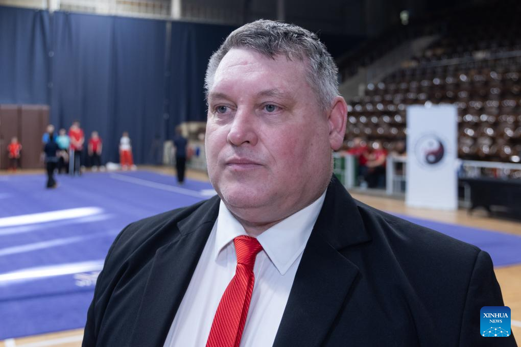 Patrick Van Campenhout, president of the European Wushu Federation, is interviewed during the European Wushu Taolu training camp in Budapest, Hungary, on Feb. 5, 2026. (Photo by Attila Volgyi/Xinhua)