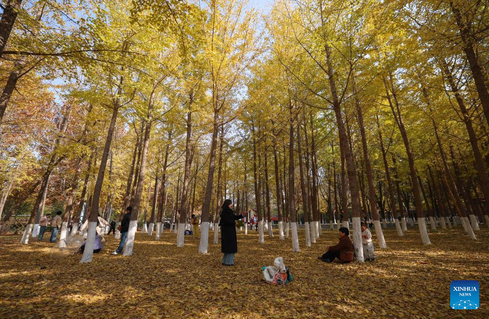 People enjoy the view of a ginkgo forest at a forest park in Tianjin, north China, on Nov. 4, 2025. (Xinhua/Sun Fanyue)