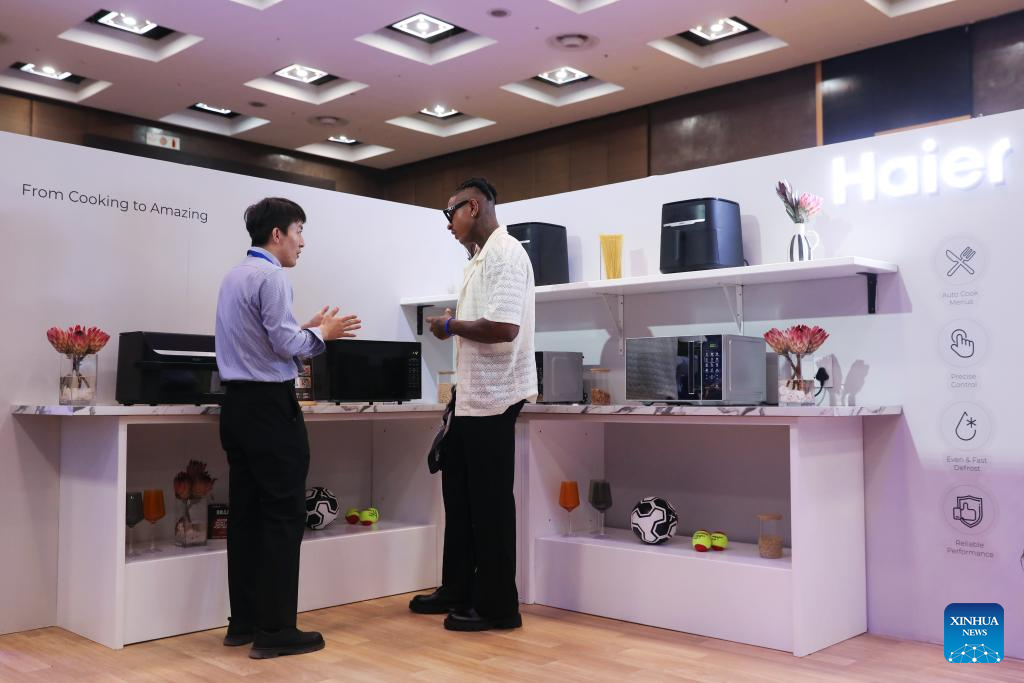 A man asks about products at Haier's launching event in Johannesburg, South Africa, Feb. 2, 2026. China's home appliance giant Haier on Monday held a launch ceremony in Johannesburg, South Africa's economic hub, marking its official entry into the South African market. (Xinhua/Chen Wei)