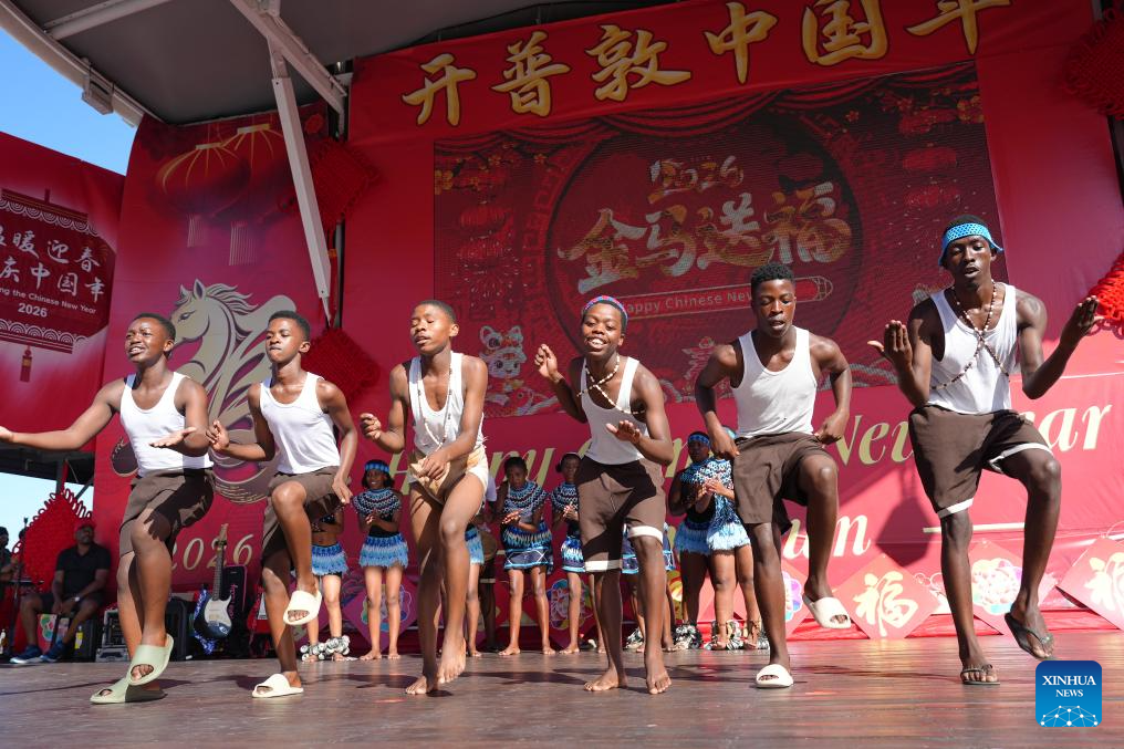 People perform a traditional Chinese dance during an event in celebration of the Chinese New Year in Cape Town, South Africa, on Feb. 1, 2026. The bustling Victoria & Alfred Waterfront in Cape Town, South Africa's legislative capital, came alive with vibrant colors and lively performances on Sunday as the upcoming Chinese New Year was celebrated.