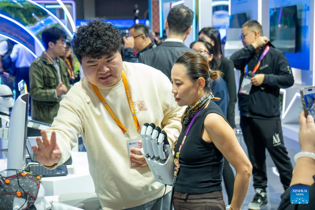 A visitor learns about a non-invasive brain-computer interface robot at the China Pavilion during the eighth China International Import Expo (CIIE) in east China's Shanghai, Nov. 5, 2025. The eighth China International Import Expo (CIIE) opened in Shanghai on Wednesday. The highlights of the China Pavilion include the latest achievements of China in comprehensively deepening reform and high-level opening-up during the 14th Five-Year Plan period (2021-2025). (Xinhua/Ding He)