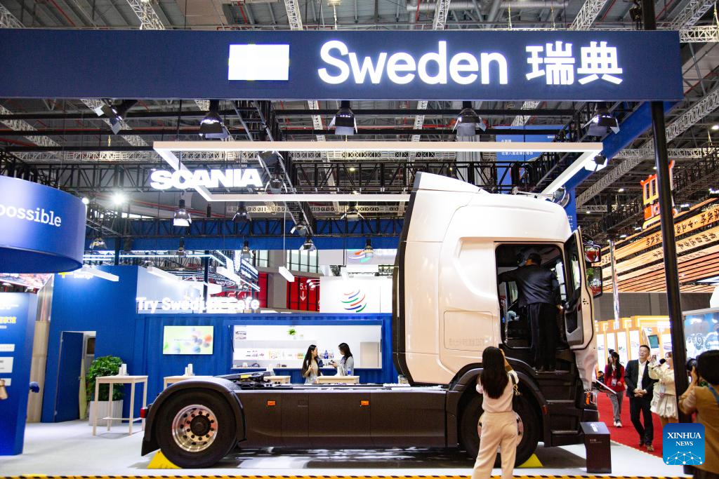 This photo shows the Sweden Pavilion during the eighth China International Import Expo (CIIE) in east China's Shanghai, Nov. 5, 2025. The eighth CIIE opened here on Wednesday. Thailand, the United Arab Emirates, Nigeria, Georgia, Sweden and Colombia serve as the guest countries of honor at this year's CIIE. (Xinhua/Fan Yuqing)